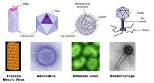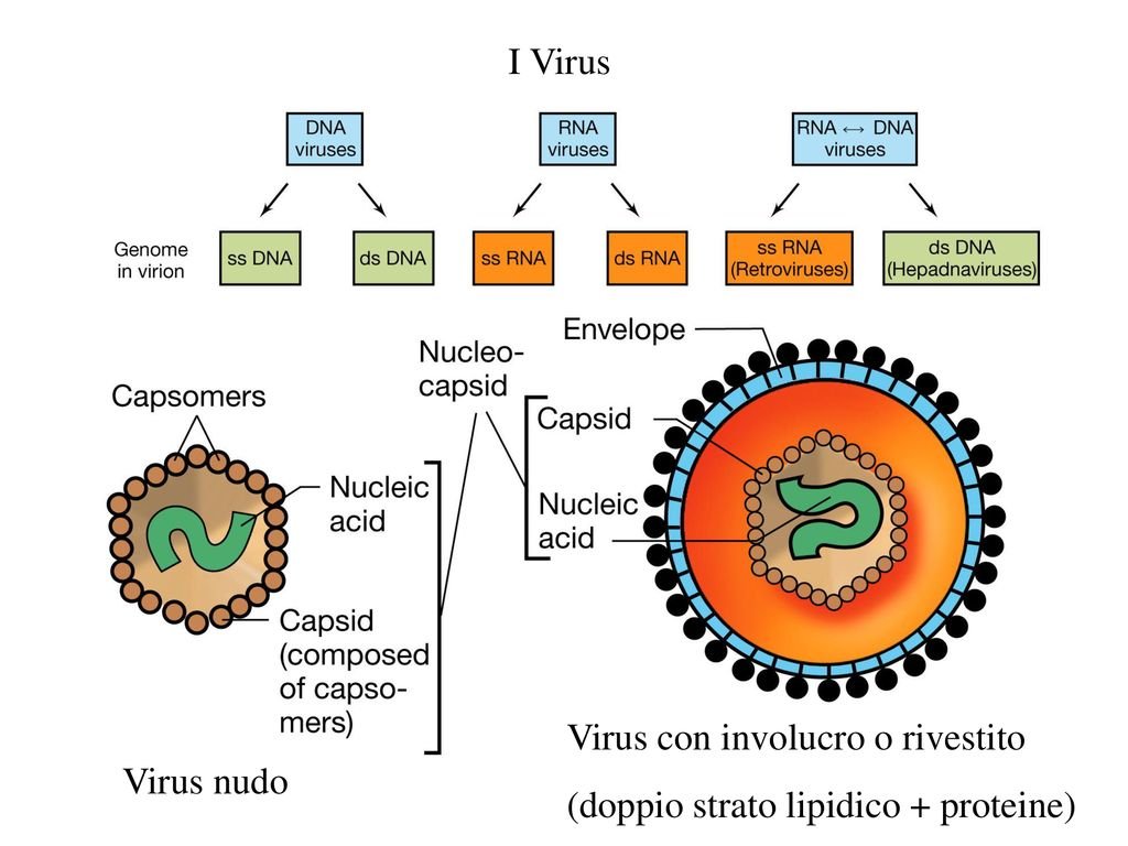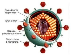 - un core interno di acido nucleico (DNA o RNA), insieme al quale vi sono le polimerasi (enzimi responsabili della duplicazione dell’acido nucleico quando infettano le cellule).